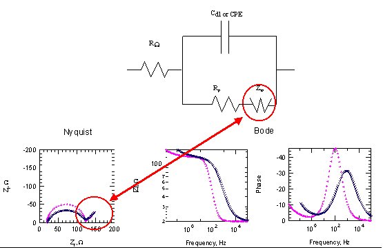 Zwワールブルグインピーダンス 電極反応には、界面の電荷移動過程や物質拡散過程等の反応からなっています。RΩは溶液抵抗、Cdl又はCPEは二重層容量、Rpは電荷移動抵抗、Zwワールブルグインピーダンスです。