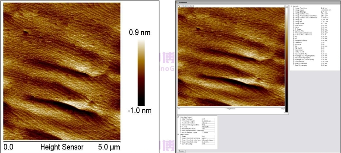 最新のグラフィカル基板技術に基づき、SinoGaN社はサファイア基板上に高品質なAlNテンプレートを開発しました。このエピタキシャルAlNの厚さは約3μmであり、XRDによる(002)面および(102)面のロッキングカーブの半値全幅(FWHM)はそれぞれ150 arcsec以下および250 arcsec以下です。単一原子ステップの表面粗さは、5×5μm2の範囲で0.1nm以下です。 インターケミ株式会社